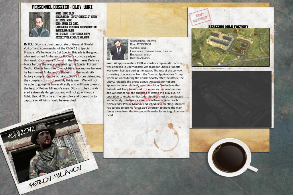 The US Ambassador to Chernarus convoy was ambushed on his way out of the country and the ambassador was taken hostage by ChDKZ forces. The ambassador was located in Berezino, held by forces from a ChDKZ SF Unit commanded by Yuri Olov, and a JSOC Task force was sent to rescue him. Commander Petrov Milanov, of the NAPA forces agreed to use his mechanized platoon to create a diversionary attack, which allowed the JSOC forces to sneak in the back of the compound and extract the ambassador with minimal contact.